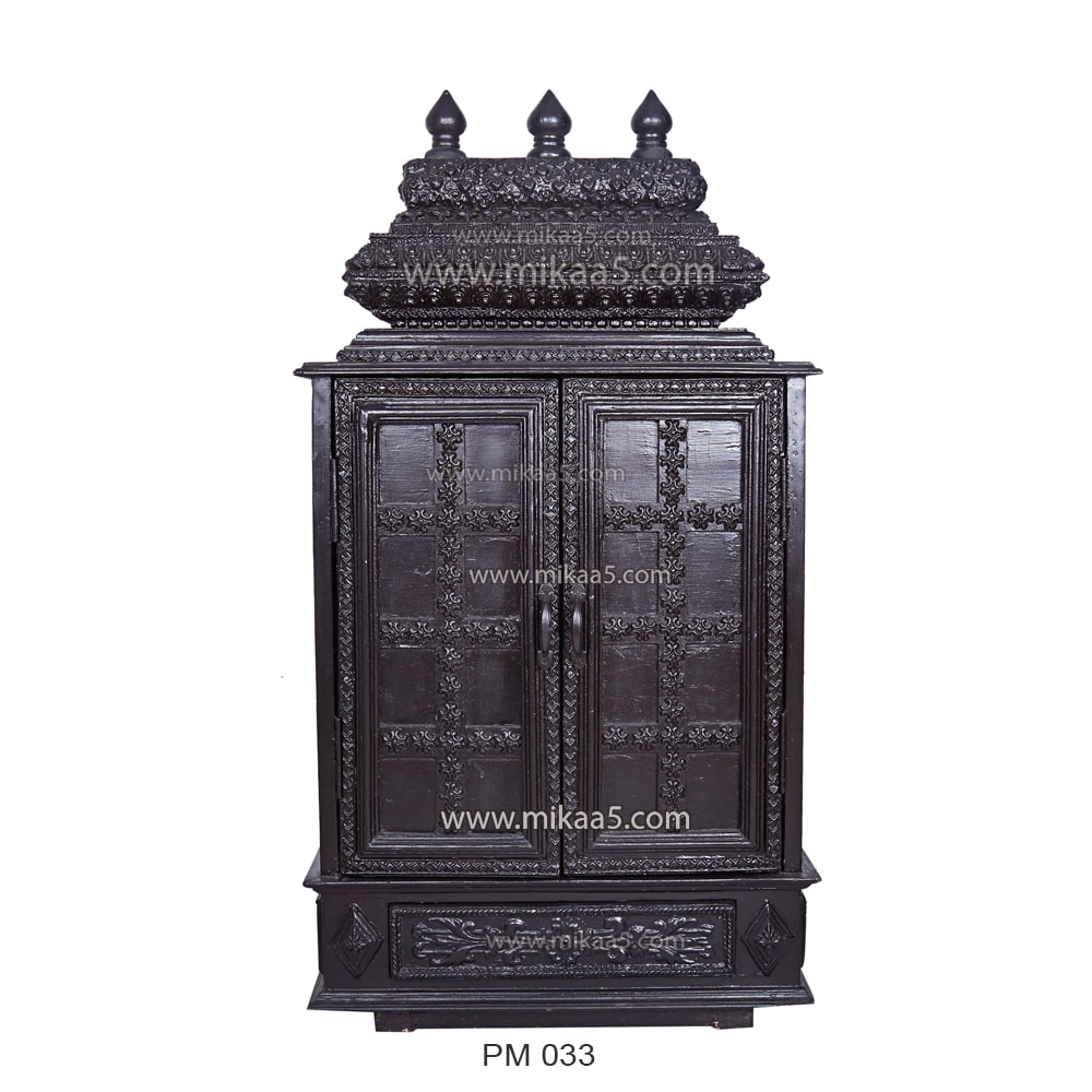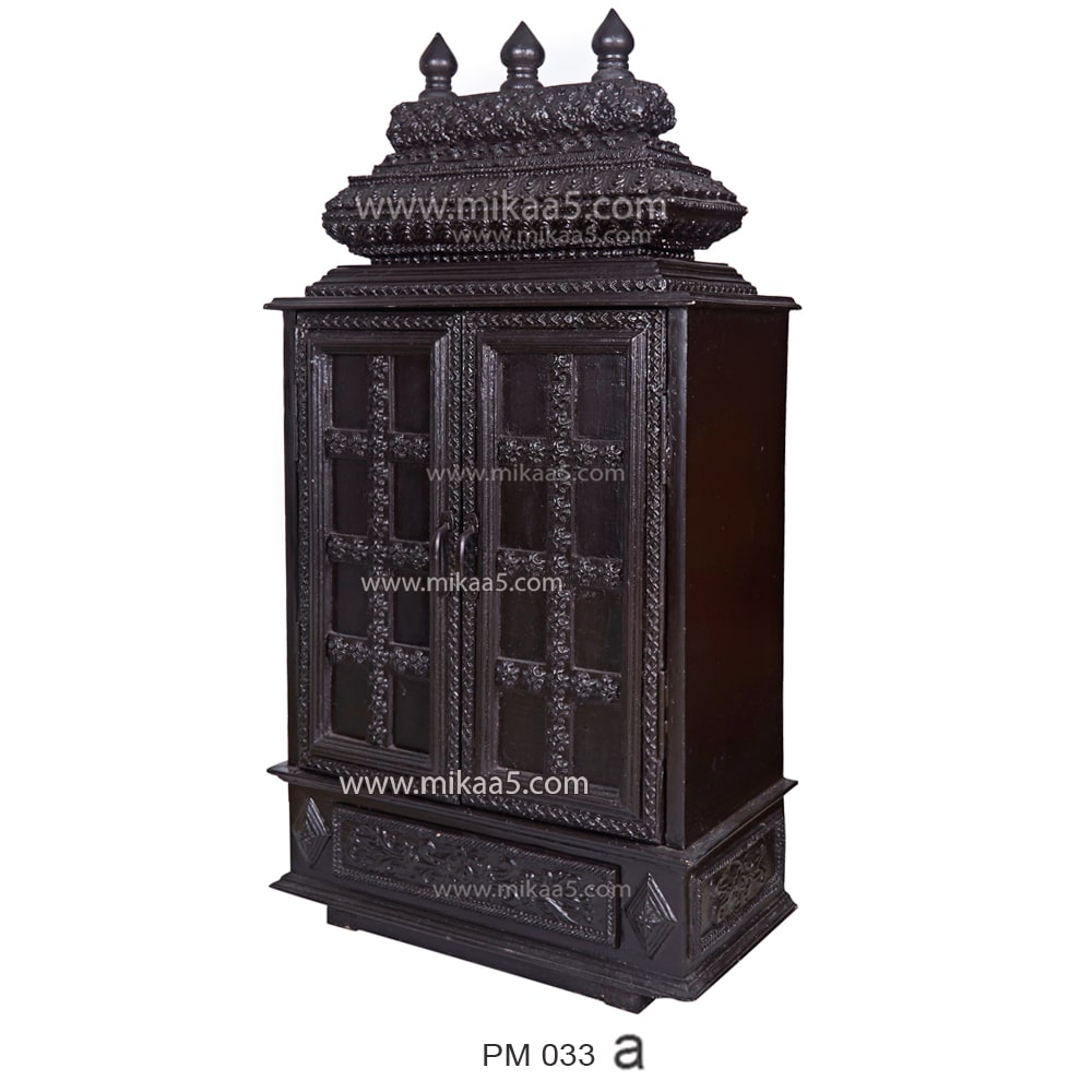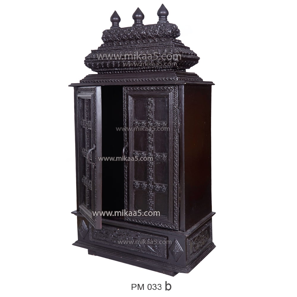 Handcrafted Fine Crafted Pooja Mandapam in dark walnut with 3 kalsam & drawer. Elegant, durable, perfect for home pooja rooms and meditation corners.