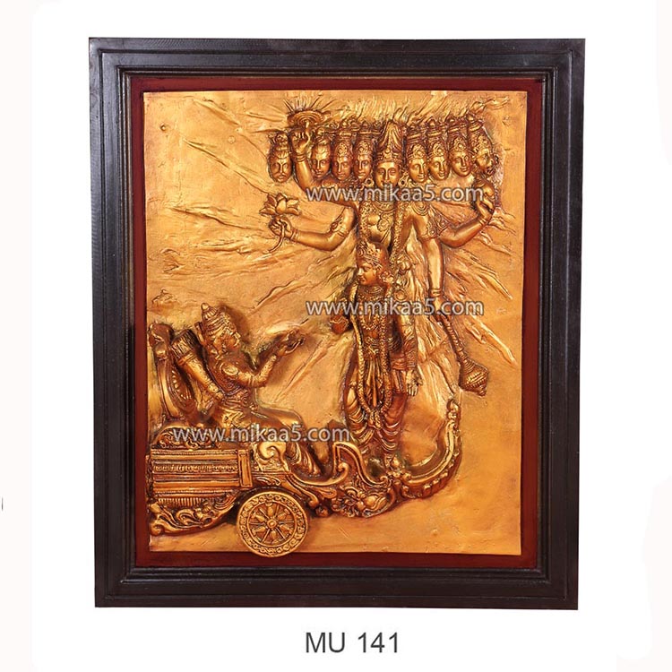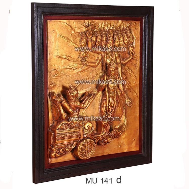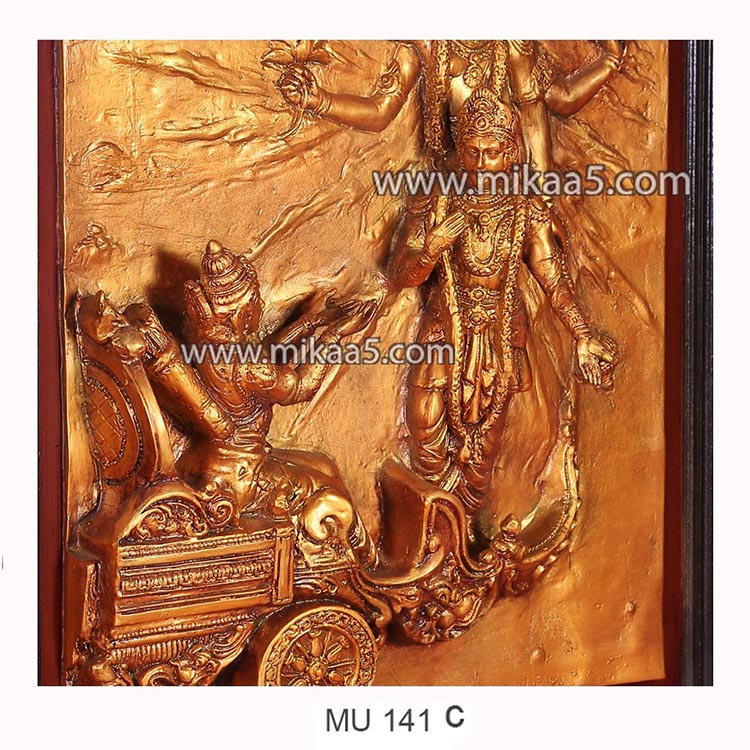 Experience the divine moment of Lord Krishna delivering the Bhagavad Gita to Arjuna through the Geeta Upadesha Mural, meticulously crafted in an antique gold finish.