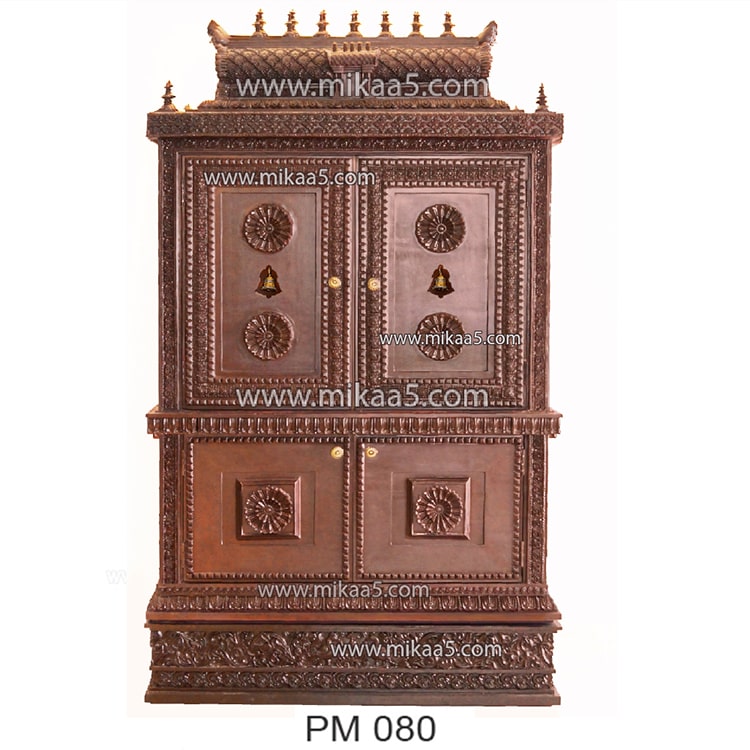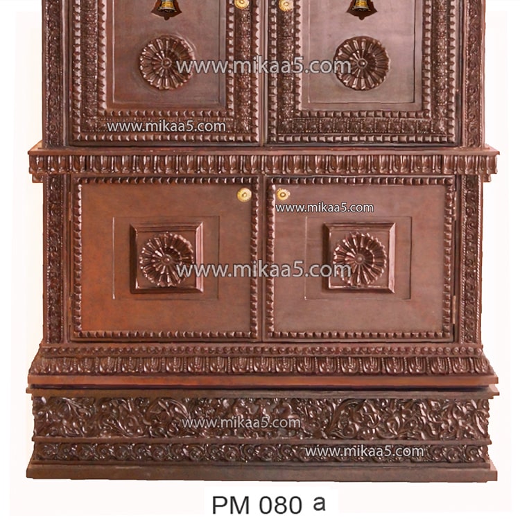 Handcrafted Wooden Pooja Mandapam in elegant brown finish. Traditional design with shelves & drawers, perfect for home temples and pooja rooms.