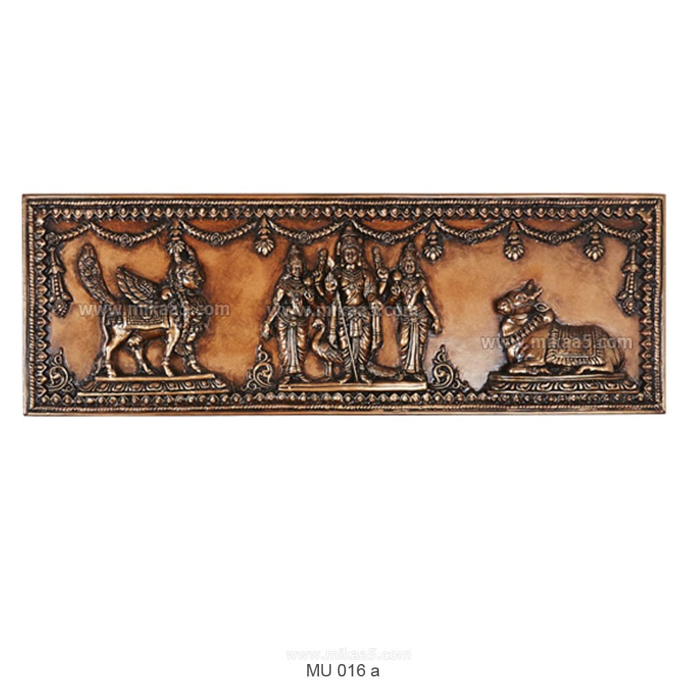 Handcrafted Kamadhenu & Murugan Suriya Palagai in copper finish. Perfect for entrances, pooja rooms, and temple walls, bringing divine blessings home.