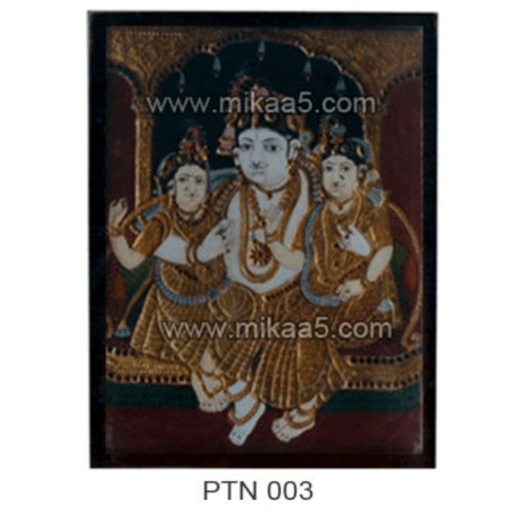 Handcrafted using traditional Tanjore techniques, this exquisite painting portrays Lord Krishna with Radha and Rukmani, capturing the essence of divine love, devotion, and timeless artistic elegance. Enhanced with detailed gold foil work, it adds a royal and spiritual charm to any interior space.