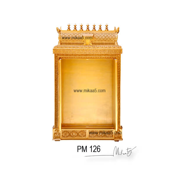 Elevate your sacred space with the Peacock Feather Pooja Mandapam, meticulously handcrafted in a luxurious gold finish. Measuring 36″ (W) × 12″ (D) × 60″ (H) and weighing 80 kg, this traditional wooden temple combines elegance with durability.