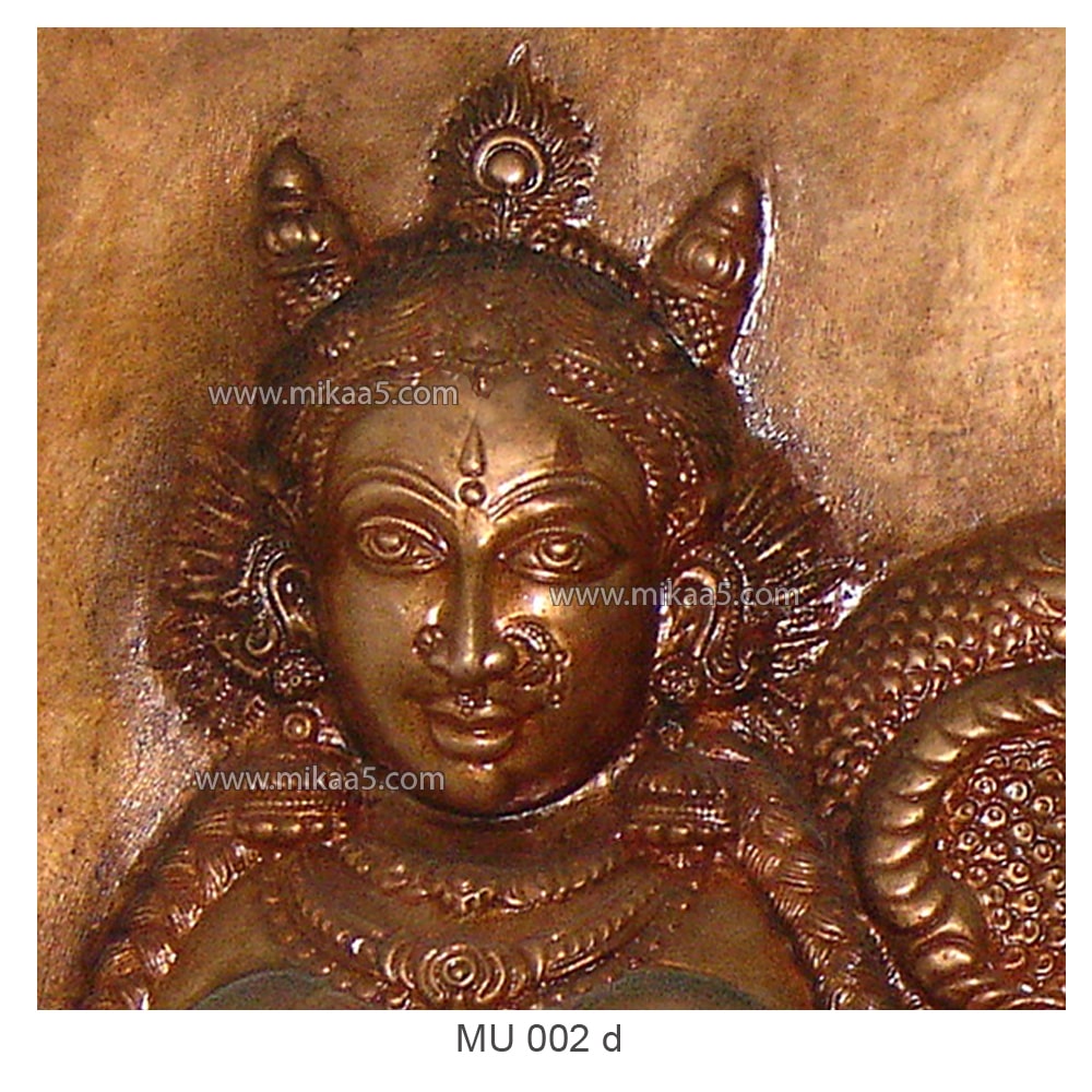 Elegant handcrafted Kamadhenu wall mural in antique copper finish, perfect for pooja rooms and vastu interiors, symbolizing prosperity and devotion
