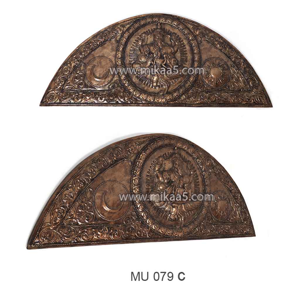 Enhance your entrance with the Traditional Wooden Surya Palagai, featuring Lakshmi-Ganapathi motifs in copper antique finish, auspicious decor for main doors.